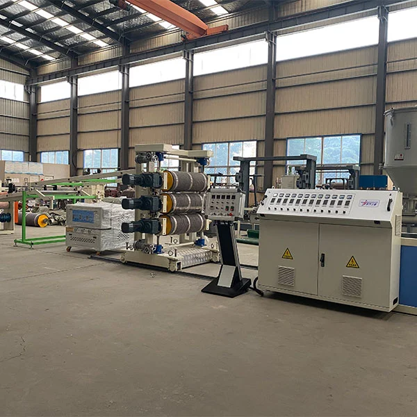 Suszone cząstki PS są transportowane do leja wytłaczarowego przez automatyczne urządzenie karmiące. Śruba wytłaczarka stopniowo wlga cząsteczki stałych PS w jednolite stopienie przez obrót i ogrzewanie zewnętrzne. Metto jest popychane do T-Die (kanał płaskiego przepływu), aby wstępnie określić szerokość arkusza. Film stopowy wchodzi do kalendarza trzech rzutu i jest szybko zestalona i uformowana. W kształcie arkusza jest ciągnięta z równomierną prędkością przez maszynę trakcyjną, a burr są usuwane przez maszynę do przycinania. Wreszcie jest wdrożony przez wietra.