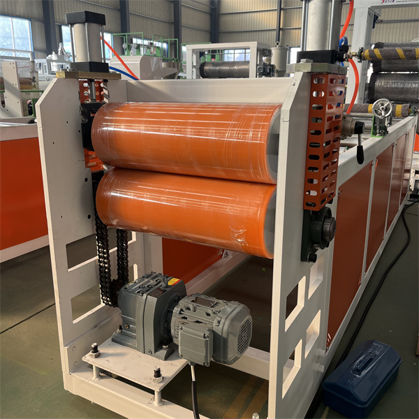 Forma arkuszowa TPU wykorzystuje chromowaną, lustrzaną głowicę T-die. Konstrukcja ścieżki przepływu jest symetryczna i gładka, bez martwych punktów, co zapewnia równomierny rozkład stopu. Szczelinę wargi matrycy można precyzyjnie regulować (z dokładnością do 0,01 mm), dostosowując się do grubości blachy od 0,1 do 5 mm. Wytłaczarka arkuszy TPU wyposażona jest w trójwalcowy zespół chłodząco-kształtujący. Powierzchnia walca jest polerowana na lustro, a temperatura wody chłodzącej jest kontrolowana przez system stałej temperatury. Pozwala to na szybkie chłodzenie i kształtowanie, zapewniając jednocześnie gładką, pozbawioną zarysowań powierzchnię. Tolerancja płaskości i grubości blachy (w granicach ±0,03 mm) kontrolowana jest poprzez docisk pomiędzy rolkami.